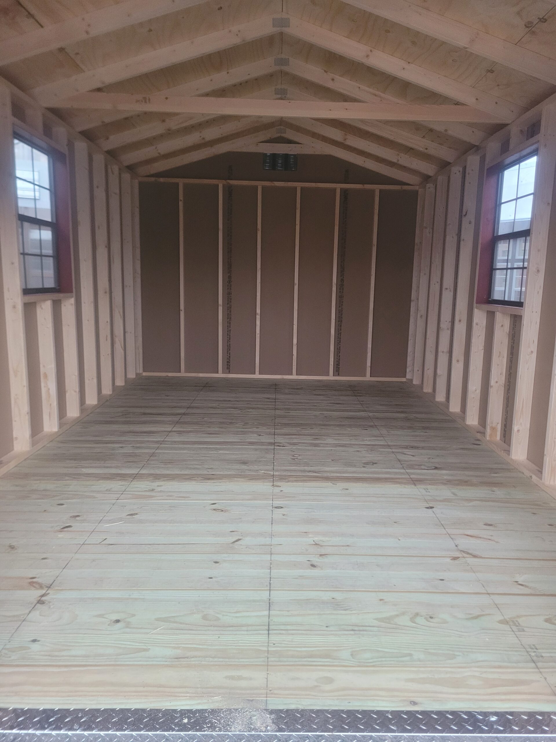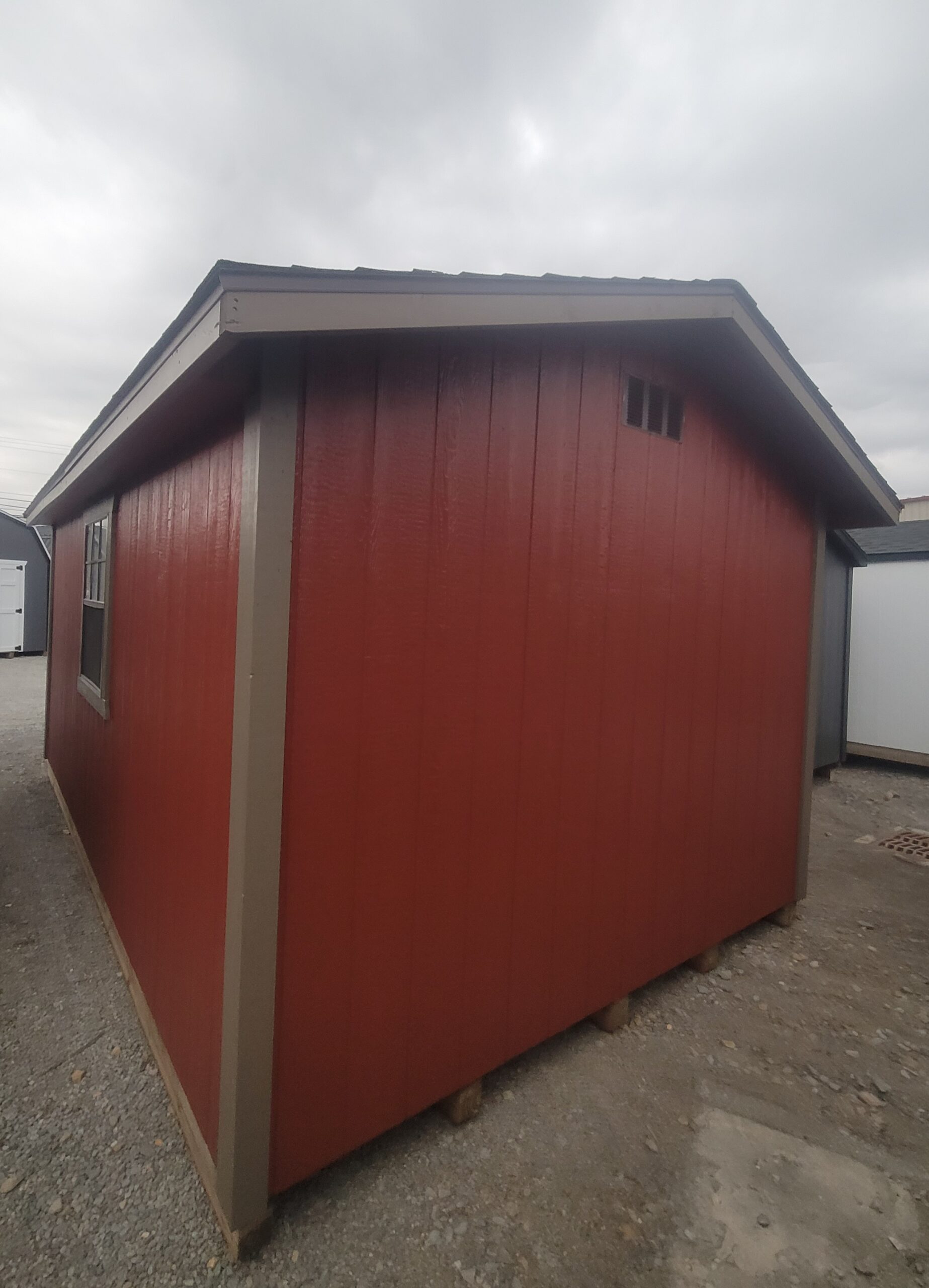 10’x16′ 7ft wall Premier Gable: Double 67″x72″ wooden doors, Transoms in the doors, 2 – 30″x36″ windows, heavy 2″x6″ T&G floor system, 30yr dimensional shingles, and painted L.P. smart paneling.
