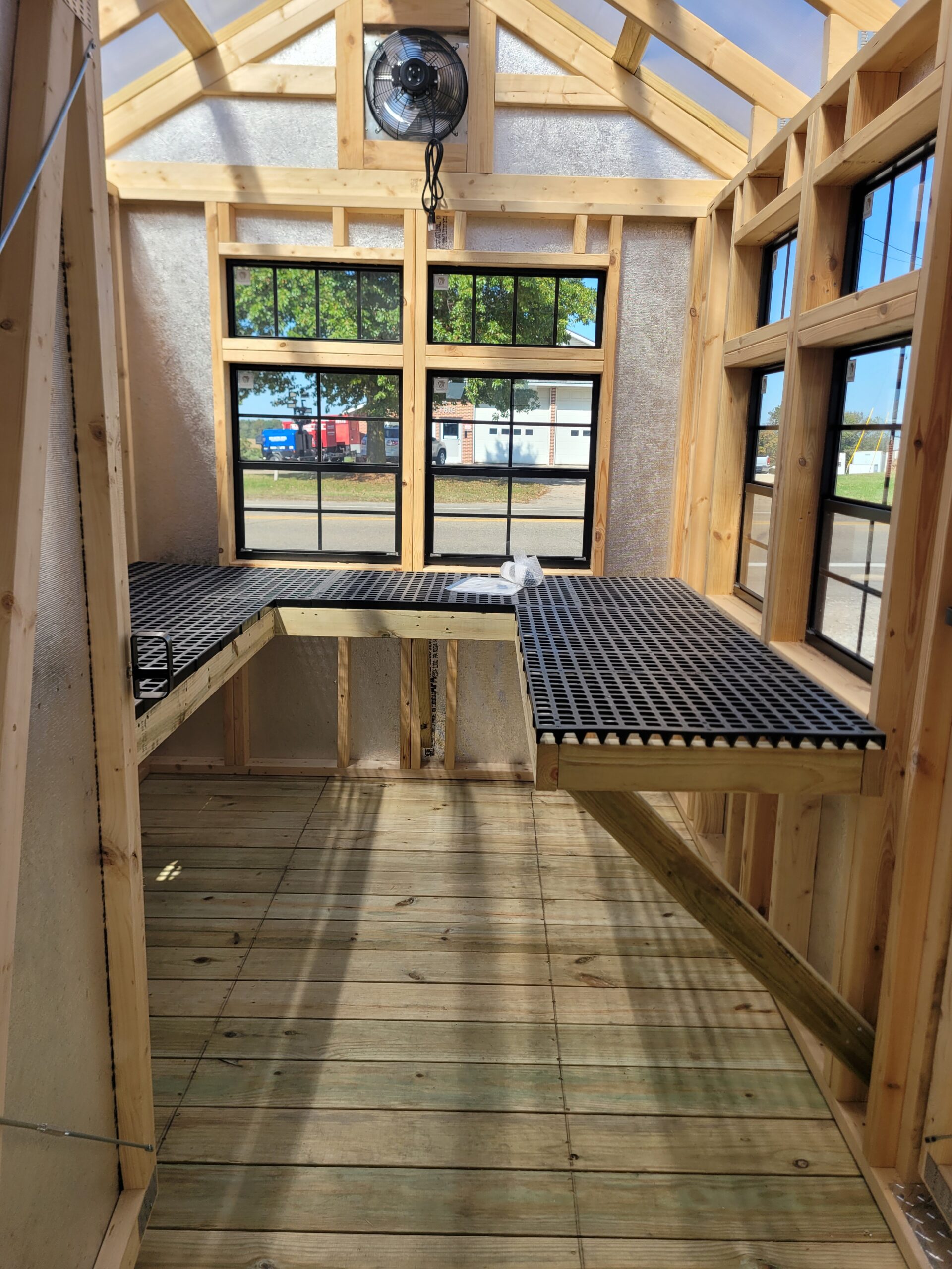 12’x22′ Storage/Greenhouse Combo: Wooden doors, Windows, Greenhouse shelving, Thermostat controlled fan, and painted.