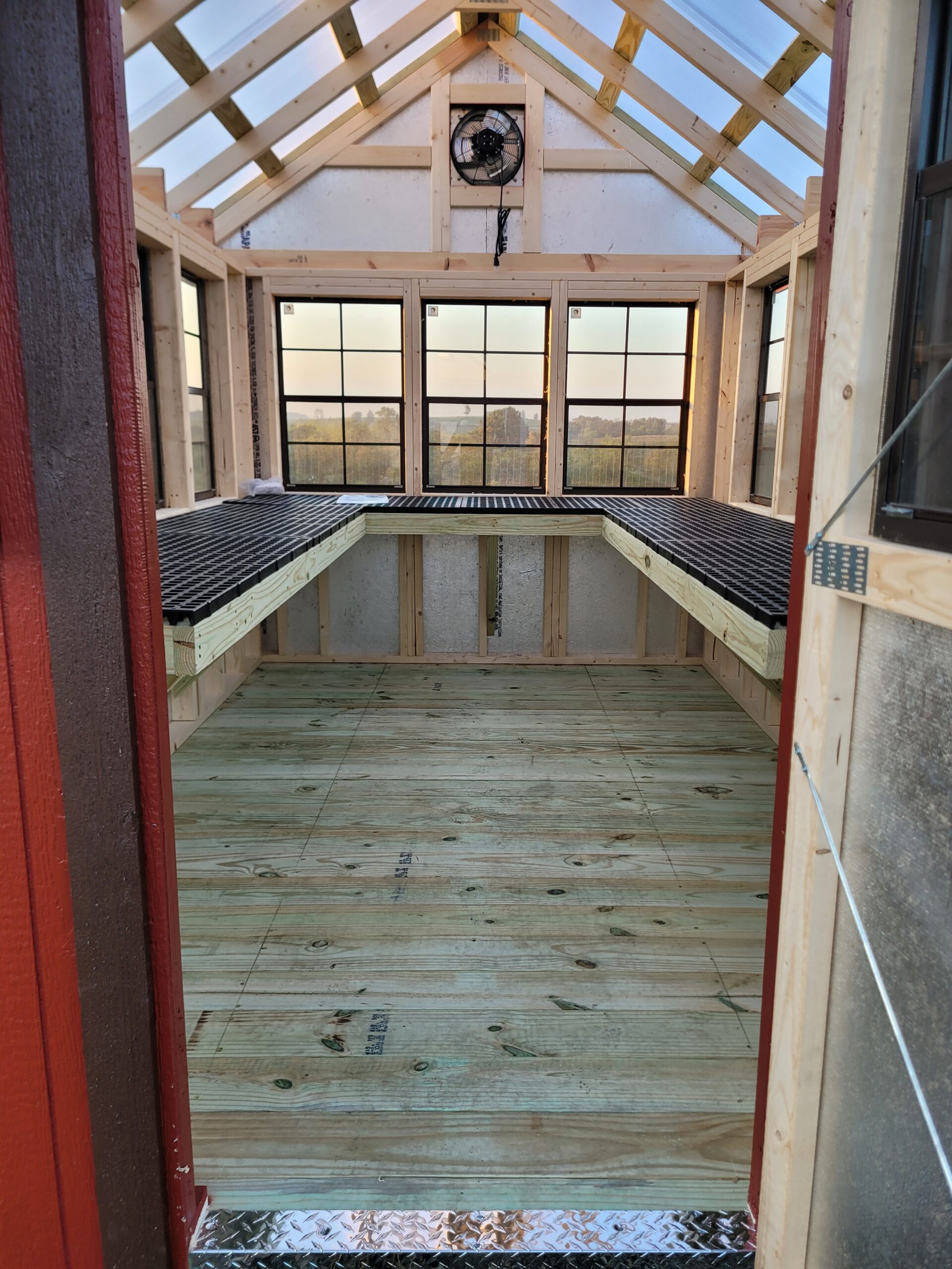 Has a single wooden door, 2″x6″ treated floor system, plastic work area, air exchange fan, painted, 50yr Smart siding, and Polycarbonate roofing.