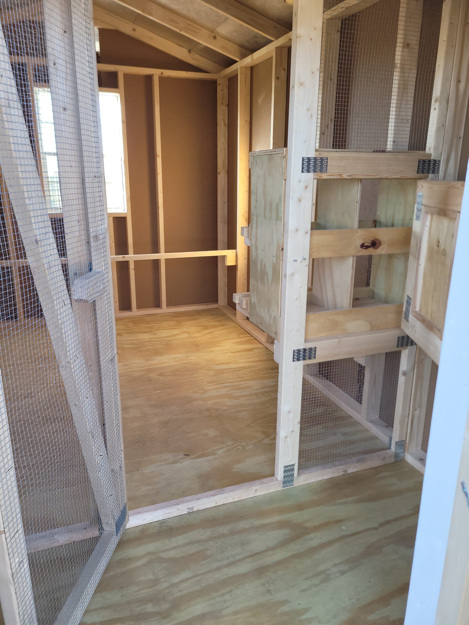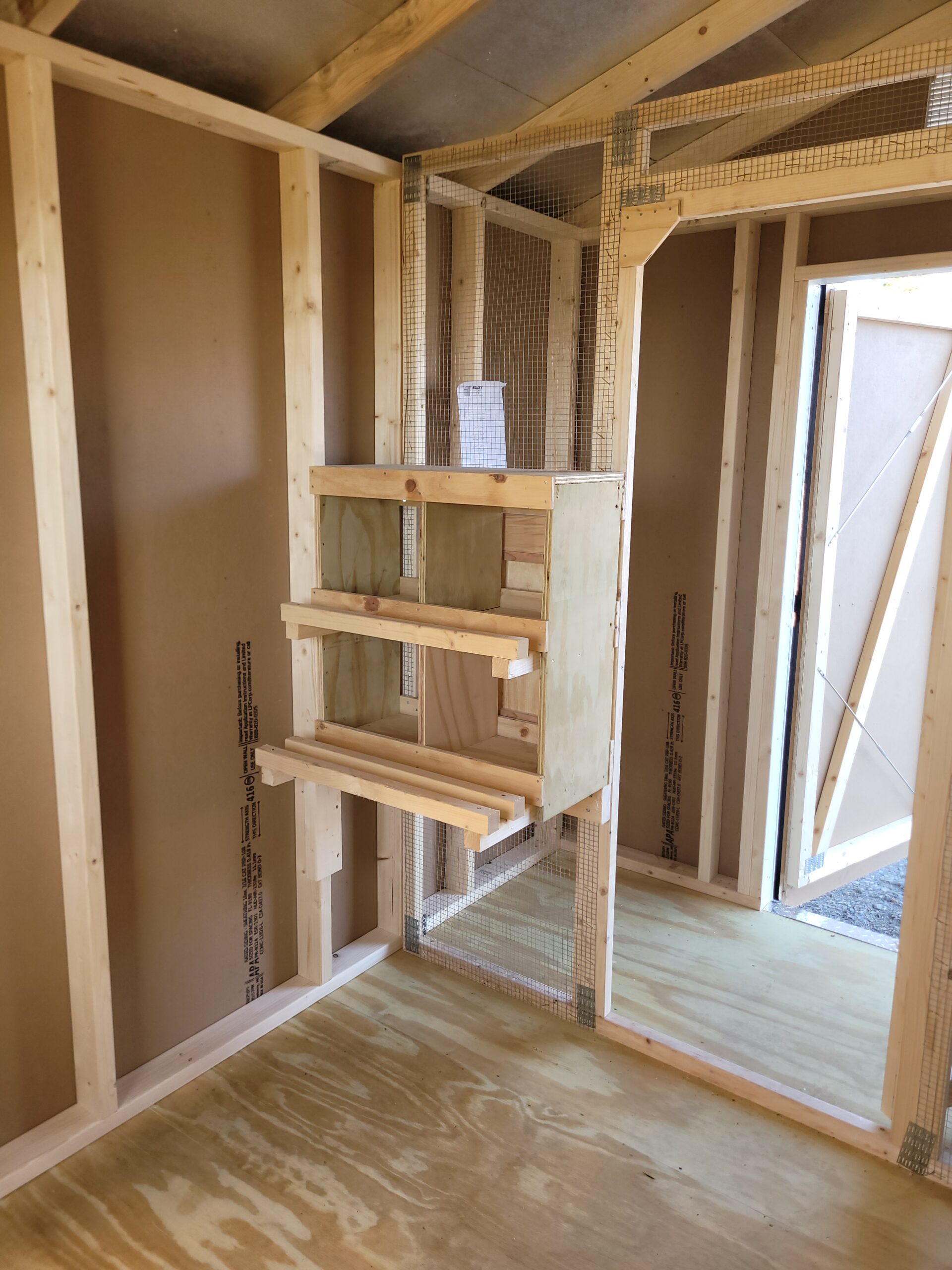 8’x12′ Chicken coop. Single wooden door, interior partition, 4 nest box, painted.