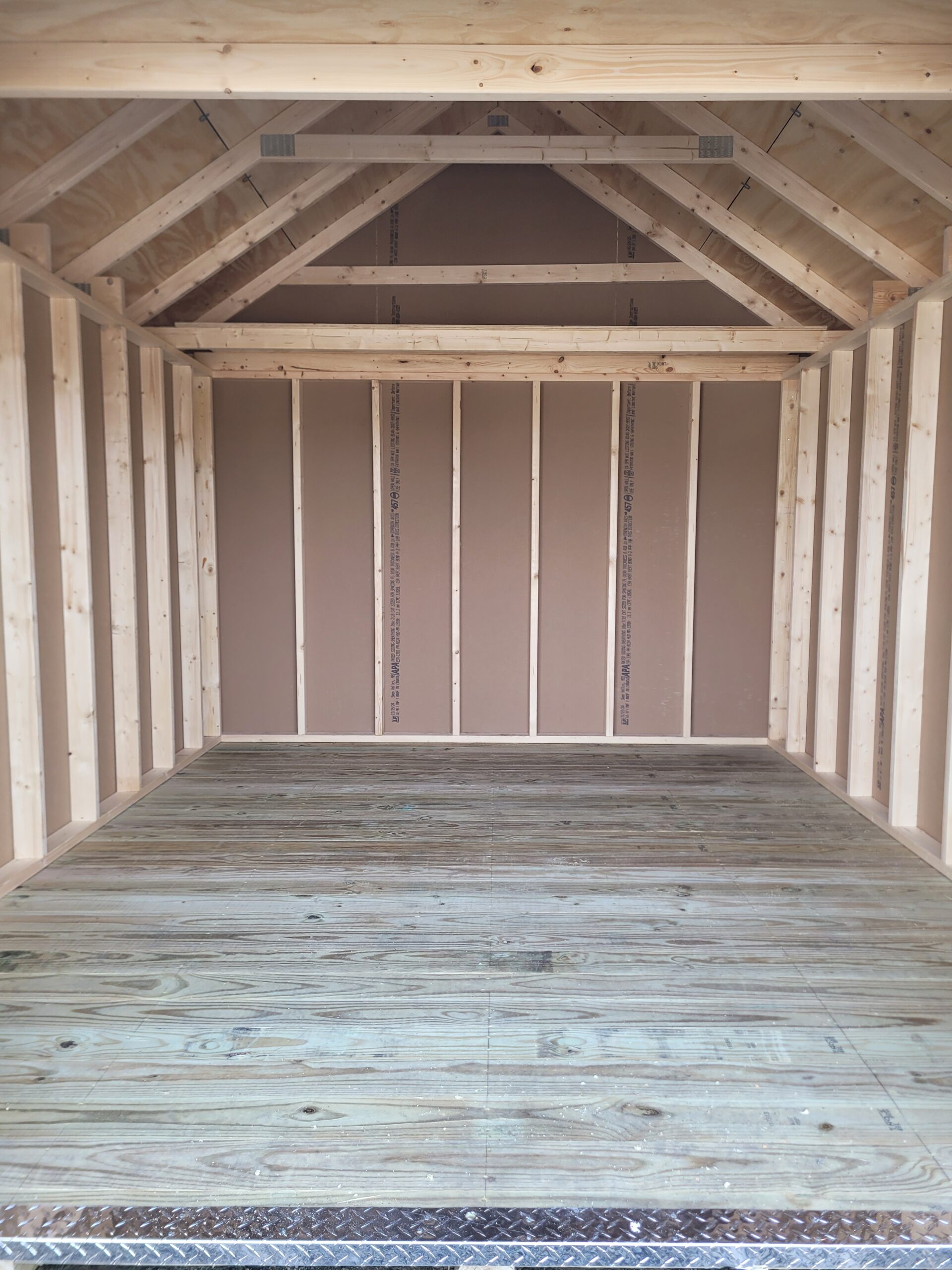 10’x12′ unit:  Double 67″x72″ wooden doors w/transom windows, 2 – 2’x10′ lofts, 50yr L.P. smart siding, 2″x6″ T&G treated floor system, stained/painted, and a 30yr shingled roof.